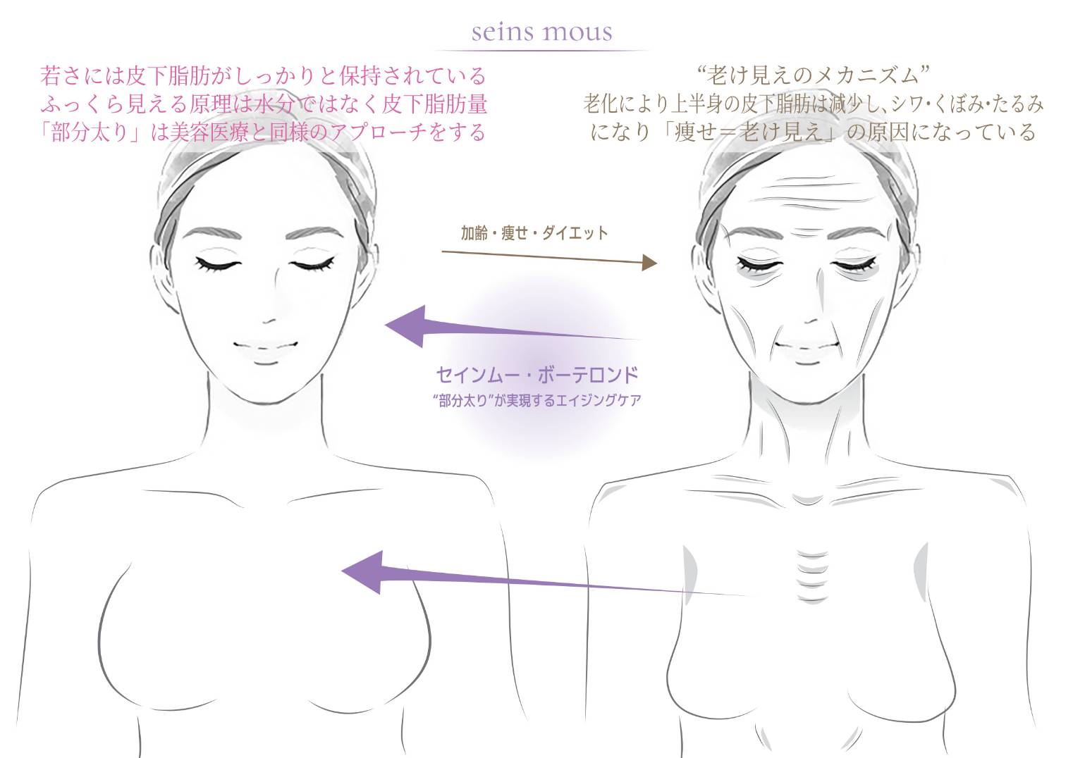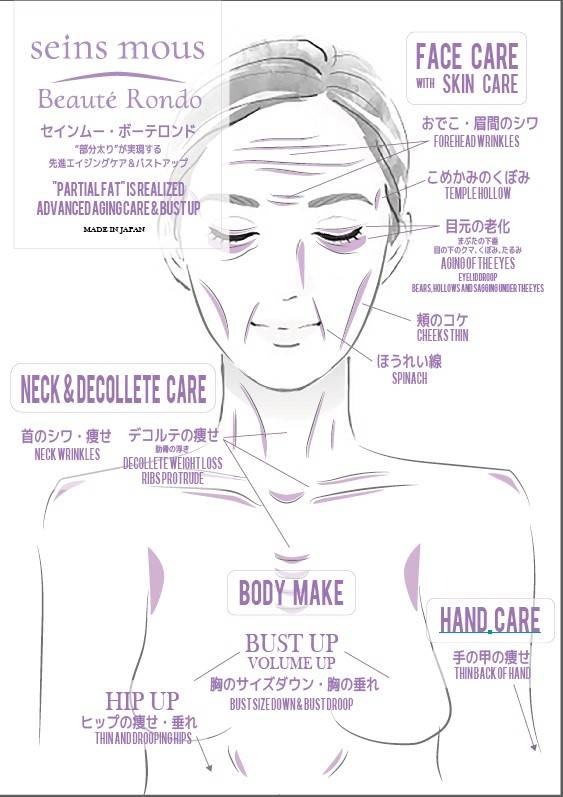 "世界最高コスメブランド・セインムー ブランドの主役となる美容液『ボーテロンド』 バストアップ&アンチエイジングの新次元"部分太り" 美容医療を基にした新発想の結果化粧品がボーテロンドです。 脂肪を増やすことで実現するバストアップ&顔の若返りを提案するオンリーワンコスメ。「ボーテロンド」は塗った所にだけ脂肪を付けられる「部分太り」を提案する新しい切り口の美容液で、男女隔てなく、全身の脂肪が欲しい所に使えます。 皮下脂肪を増大コントロールすることでバストアップ・アンチエイジングに効果が期待できるという美容医療のメカニズムを元にした新次元の美容液です。 ボーテロンドは塗る部位により、 ① バスト・ヒップ ② 顔周り(目の周り、頬、おでこ、ほうれい線など) ③ 首・デコルテ ④ 手の甲 をケアできます。 脂肪にアプローチする化粧品有効成分に 「ボルフィリン」 「アデフィリン」 「セルアクティブ」の3種を日本初で採用しています。 美容液全量に対して20%という超高濃度を実現している美容液です。 世界一の有効成分含有量を追求し、「欲しい所にだけ脂肪が欲しい」にトライし製品で症例をもっている稀な化粧品です。 ブランドの特徴でもある美容液の薫りは、配合しているオリジナルの香水ノムドセインムーです。 発売の背景には、ダイエット・ファスティング・など体重を落とすことが主流の現在があります。 極端なダイエットは女性らしい丸みを失わせ、老けの原因にもなっています。 女性の願いであった部分痩せと共に実現したかった"部分太り"。 女性の美しさに新しい選択肢を与えます。"