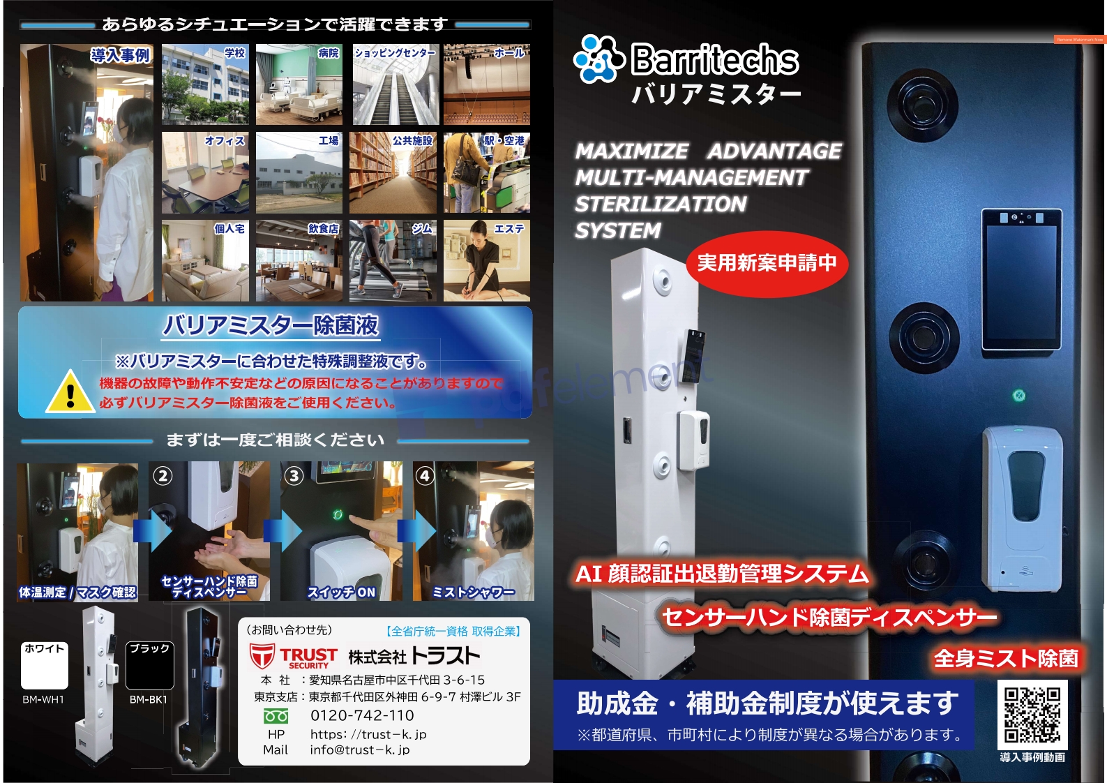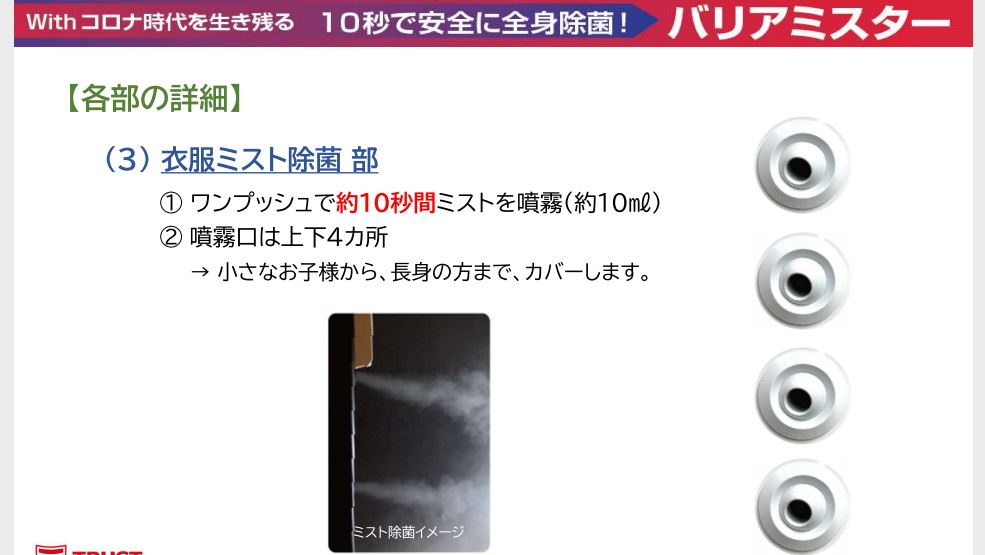 コロナウイルスや、インフルエンザウイルスへの効果が実証されている溶液(=バリテックス溶液)を全身に噴霧し、衣服等に付着している可能性のある菌を死滅させます。